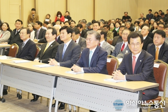 | 14일 정부세종컨벤션센터 국제회의장에서 열린 국가균형발전선언 13주년 기념 학술 심포지엄 행사에 참석한 문재인 더민주당 전 대표가 앞줄 왼쪽부터 이해찬 국회의원, 정세균 국회의장, 이춘희 세종시장, 이시종 충북지사와 함께 권선택 대전시장의 축사를 듣고 있다./아시아뉴스통신=홍근진 기자 |