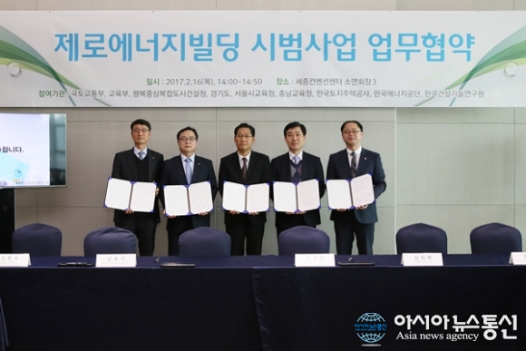 행복도시건설청이 16일 국토교통부, 제로에너지빌딩지원센터(한국건설기술연구원, 한국에너지공단), 한국토지주택공사 세종본부와 세종시 ‘제로에너지타운’ 조성을 위한 MOU를 체결했다.