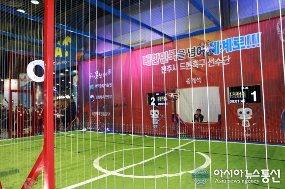 드론 축구경기는 탄소소재 와 드론 기술을 융합해 개발한 축구공 모양을 한 드론 5대가 한 팀으로 상대팀 골대에 들어갈 때 득점을 하는 공중 경기로서 국민체육진흥공단의 지역융복합사업 지원을 받은 기업들이 참여해서 진행됐다.