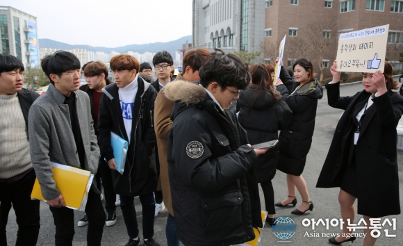 | 23일 진행된 대구과학대학교 2017학년도 신입생 오리엔테이션에서 총학생회 학생들이 신입생들에게 총학생회 페이스북 가입을 안내하고 있다.(사진제공=대구과학대학교) |