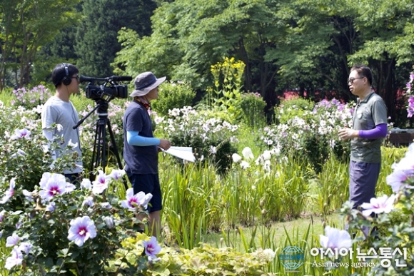 | 한국영상대 교수와 학생들이 지난해 8월 천리포 수목원에서 ‘무궁화 꽃이 피었습니다’를 촬영하고 있다.(사진제공=한국영상대) |