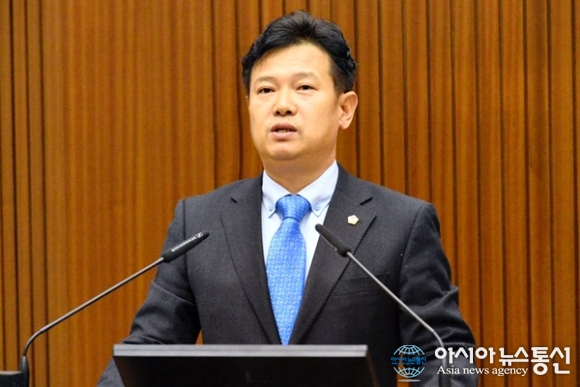| 6일 세종시 보람동 의회 신청사 준공이후 처음으로 열린 세종시의회 제42회 임시회 제1차 본회의에서 5분 발언에 나선 김원식 의원이 “북세종 통합 행정복지센터를 구 시청사인 조치원청사로 이전해야 한다”고 주장하고 있다.(사진제공=세종시의회) |