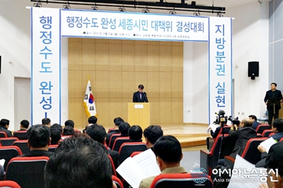 | 6일 세종시 고운동 복합커뮤니티센터 3층 문화관람실에서 열린 행정수도 완성 세종시민 대책위원회 결성대회에서 상임대표를 맡은 맹일관 세종시이통장연합회장이 발언을 하고 있다. 이날 결성대회에서는 “세종시를 대한민국의 행정수도로 완성하자”는 내용의 결성선언문이 낭독됐다. 한편 대책위는 지난 3일 준비회의에서 조직명을 ‘행정수도 완성 세종시민 대책위’로 개정키로 했고 대표자회의를 개방적이고 완결된 조직구성을 위해 결성대회 이후 개최키로 했으며 최정수 세종신도시입주자대표자연합회장과 맹 씨를 상임대표로 김수현 세종참여자치시민연대 사무처장을 집행위원장에 선임했다. 또 현재까지 200여개 단체가 참여를 신청했다.(사진출처=SNS화면캡쳐) |