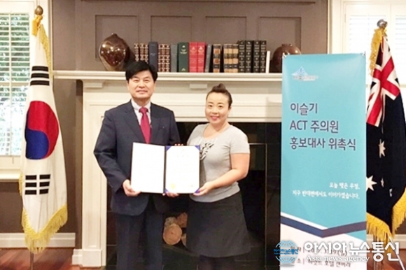 | 호주를 방문 중인 이춘희 세종시장(왼쪽)이 19일 캔버라 하얏트호텔에서 엘리자베스 리(Elizabeth Lee.한국명 이슬기.오른쪽) 수도준주 지역(Australian Capital Territory.ACT) 주의원을 세종시 친선대사로 위촉하고 기념포즈를 취하고 있다.(사진제공=세종시청) |