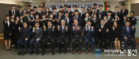 | 21일 대구과학대학교 국제세미나실에서 진행된 2017학년도 학생임원임명식에서 지도교수들과 학생임원들이 단체 기념촬영을 하고 있다.(사진제공=대구과학대) |
