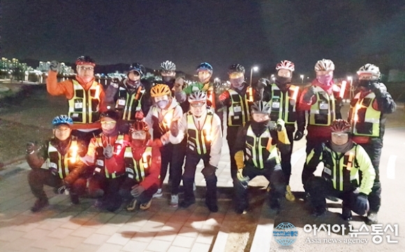 | 세종경찰서(서장 마경석) 한솔파출소(소장 김재순) 자전거 순찰대원 20여명이 26일 저녁 파출소 앞에서 절도예방을 위한 동네사랑 순찰을 실시하고 기념사진을 찍고 있다.(사진제공=세종경찰서) |