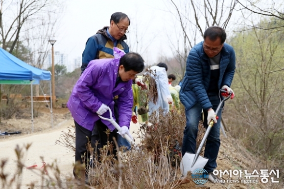 | 5일 제72회 식목일을 맞아 이충재 행복도시건설청장(왼쪽)과 직원들이 세종시 신도시 원수산 생태공원 입구부터 산책로를 따라 약 1000여 그루의 영산홍을 심었다.(사진제공=행복청) |