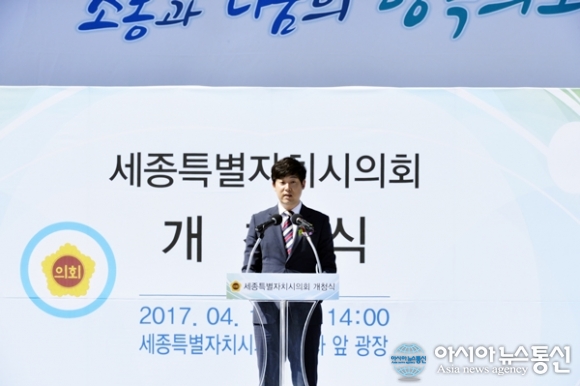 | 고준일 세종시의회 의장이 12일 보람동 신청사 앞 광장에서 열린 개청식에서 기념사를 통해 “낮은 자세로 시민을 섬기는 의회가 되도록 최선을 다 하겠다”고 말했다.(사진제공=세종시의회) |