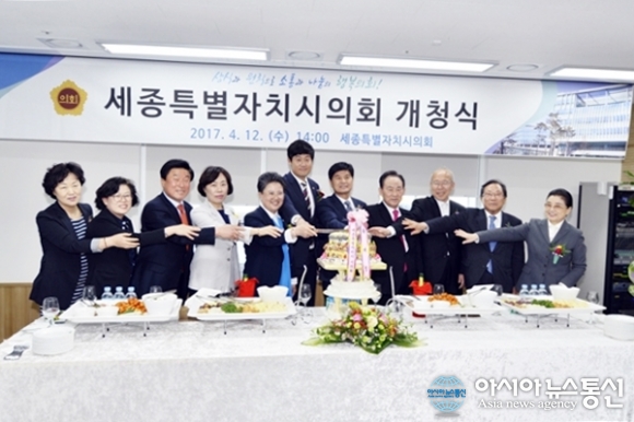 | 12일 세종시의회 개청식 식후행사로 1층 대회의실에서 고준일 의장, 이춘희 시장, 유환준 전 의장과 정준이 김복렬 김정봉 박영송 의원을 비롯한 참석자들이 축하 떡을 자르고 있다.(사진제공=세종시의회) |
