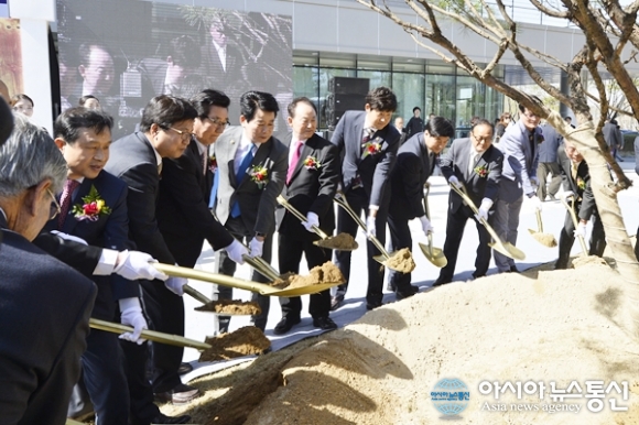 | 12일 보람동 신청사 앞 광장에서 열린 세종시의회 개청식에서 고준일 의장, 이춘희 시장, 최교진 교육감, 이충재 행복청장, 윤석우 전국시도의회의장협의회장, 유환준 전 의장 등 내외빈들이 기념식수를 하고 있다.(사진제공=세종시의회) |
