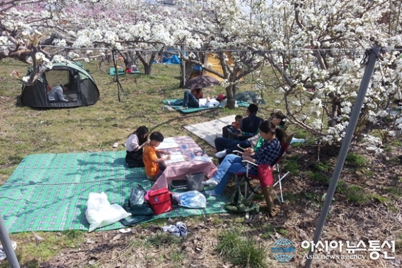 | 15일 복사꽃과 배꽃이 장관을 이룬 세종시 조치원읍 문화예술회관 일원에서 열린 ‘제15회 세종시 조치원 복숭아 봄꽃 축제’ 행사중 ‘전국 어린이 사생대회’에 참가한 어린이들이 배꽃 아래서 열심히 그림을 그리고 있는 동안 아빠와 엄마는 낮잠을 자는 등 휴일을 즐기고 있다./아시아뉴스통신=홍근진 기자 |
