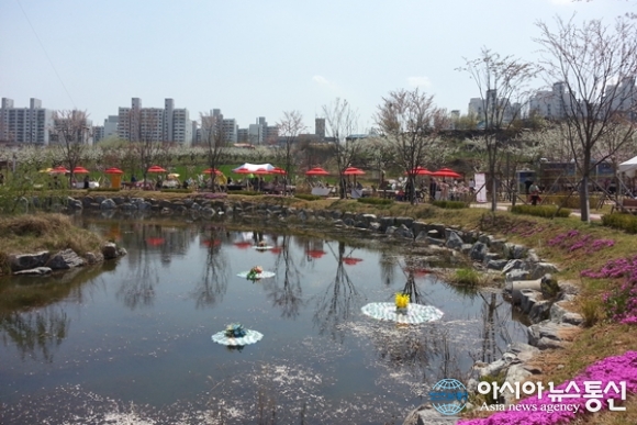 | 15일 세종시 조치원읍 문화예술회관 일원에서 열린 ‘제15회 세종시 조치원 복숭아 봄꽃 축제’에서 연못 주변에 진을 친 아트마켓과 그 너머 배꽃 그리고 아파트 단지가 마치 한 폭의 그림과 같이 펼쳐져 있다./아시아뉴스통신=홍근진 기자 |