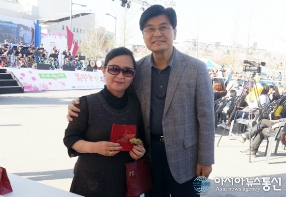 | 15일 세종시 조치원읍 문화예술회관 일원에서 열린 ‘제15회 세종시 조치원 복숭아 봄꽃 축제’에서 ‘황금꽃을 찾아라’ 보물찾기 이벤트에서 황금 복숭아 꽃을 찾아 영광을 차지한 조치원읍 김옥순씨를 축하하며 기념사진을 찍고 있는 이춘희 세종시장.?‘황금꽃을 찾아라’ 보물찾기 이벤트는 16일에도 1명의 주인공을 기다리고 있다./아시아뉴스통신=홍근진 기자 |