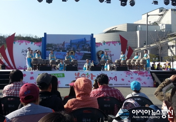 | 15일 세종시 조치원읍 문화예술회관 일원에서 열린 ‘제15회 세종시 조치원 복숭아 봄꽃 축제’에서 연동면 주민자치 프로그램 난타 풍물단이 공연하고 있다. 이날 프린지 페스티벌 무대에는 각 읍면동 주민자치 프로그램에서 수준급 실력을 가진 팀들이 나와 구경꾼들을 즐겁게 했다./아시아뉴스통신=홍근진 기자 |