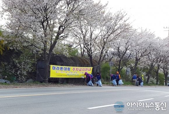 | 16일 벌어지는 복사꽃마라톤대회에 앞서 세종시 연서면 바르게살기위원회가 지난 14일 시민체육관~고복저수지에 이르는 대회코스 도로변에 버려진 빈병 등 쓰레기를 수거했다. 연서면은 농가주부모임 새마을협의회 적십자봉사회 생활개선회 귀농귀촌협의회 주민자치위원회 지역사회보장협의체 등 사회봉사단체들을 중심으로 지난달부터 복사꽃마라톤 구간에서 환경정화 활동을 펼쳐 왔다.(사진제공=세종시청) |