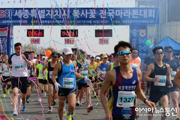 | 16일 세종시민체육관을 출발해 고복자연공원을 돌아오는 코스에서 열린 ‘제15회 세종시 복사꽃 마라톤대회’에서 10km 참가자들이 출발을 알리는 신호와 함께 힘차게 출발하고 있다./아시아뉴스통신=홍근진 |