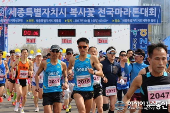 | 16일 세종시민체육관을 출발 고복자연공원을 돌아오는 코스에서 열린 ‘제15회 세종시 복사꽃 마라톤대회’에서 하프코스(21.0795km) 참가자들이 출발을 알리는 신호와 함께 힘차게 출발하고 있다./아시아뉴스통신=홍근진 기자 |