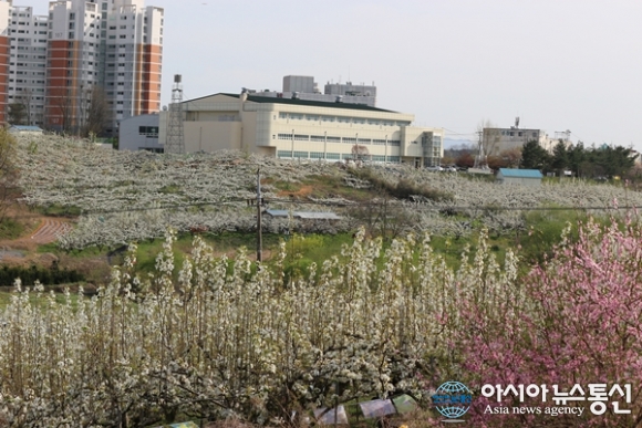 | 16일 ‘제15회 세종 조치원복숭아 봄꽃 축제’가 열리고 있는 세종시 조치원읍 신흥리 문화예술회관 일원에 흐드러지게 핀 배꽃과 복숭아 꽃이 무릉도원을 연상케 한다. 문화예술회관 쪽에서 시민체육관을 바라본 장관./아시아뉴스통신=홍근진 기자 |