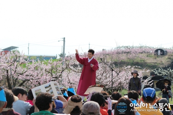 | 16일 이틀째를 맞은 ‘제15회 세종 조치원복숭아 봄꽃 축제’ 힐링 콘서트 ‘花通’에서 국악인 남상일이 복숭아 꽃이 흐드러지게 핀 야외무대에서 멋진 무대 매너와 함께 공연을 하고 있다./아시아뉴스통신=홍근진 기자 |
