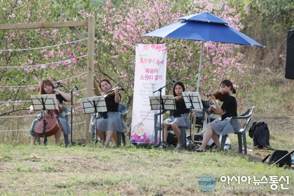 | 16일 이틀째를 맞은 ‘제15회 세종 조치원복숭아 봄꽃 축제’ 중 둘레길 언덕위에서 열린 버스킹 공연 장면. 아름다운 바이올린과 첼로의 선율이 복숭아 꽃과 어울려 따스한 봄날 몽환적인 분위기를 자아내고 있다./아시아뉴스통신=홍근진 기자 |