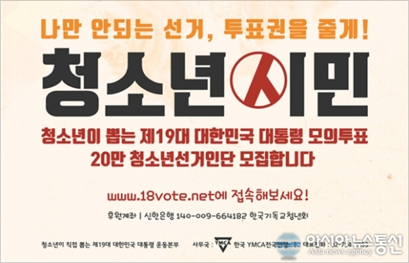 모의투표는 다음달 8일까지 온라인(www.18vote.net)과 오프라인(한국YMCA 전국연맹, 세종YMCA 등 전국 70개 지역YMCA)에서 대통령 선거를 위한 20만명 청소년선거인단을 모집해 실시한다.