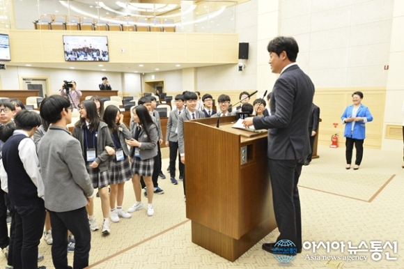 | 세종시의회가 27일 종촌중학교 학생 40명을 대상으로 제1기 청소년 의회교실을 열고 고준일 의장이 학생들과 이야기를 나누고 있다. 의회교실은 지방의회 기능에 대해 역할 체험을 통한 시민의식 함양과 의정활동에 대한 이해를 돕기 위해 마련된 프로그램이다. 고준일 의장은 “우리 세종시의회는 시민들의 방문을 언제든지 환영한다”며 “초중고 견학 프로그램과 시민 의회교실 등 수요자 중심의 다양한 의정서비스 구현에 최선을 다하겠다” 고 밝혔다.(사진제공=세종시의회) |