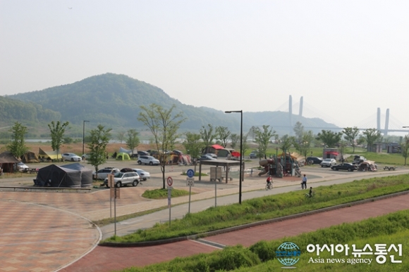 | 29일부터 시작된 연휴로 가족단위로 온 캠핑족들로 세종시 합강오토캠핑장이 북적거리고 있다. 세종리에 자리잡고 있는 한강 오토캠핑장은 청주쪽에서 흘러드는 미호천과 대청댐에서 내려오는 금강이 만나는 지점에 자리잡아 하늘과 강이 만나는 곳이라는 말이 잘 어울린다. 멀리 새로 놓은 아람찬교가 보이고 있다./아시아뉴스통신=홍근진 기자 |