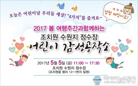세종시는 문체부의 ‘2017 봄 여행주간’과 조치원 문화재생 프로그램을 접목해 오는 5일 오전 11시부터 오후 5시 30분까지 조치원 수원지 정수장에서 ‘어린이 감성공작소’를 개최한다고 밝혔다.