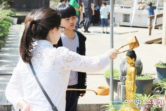 | 3일 불기 2561년 부처님 오신날을 맞아 세종시 장군면에 있는 영평사에서 열린 봉축법요식에 참석한 한 불자가 부처님 욕불의식을 하고 있다./아시아뉴스통신=홍근진 기자 |
