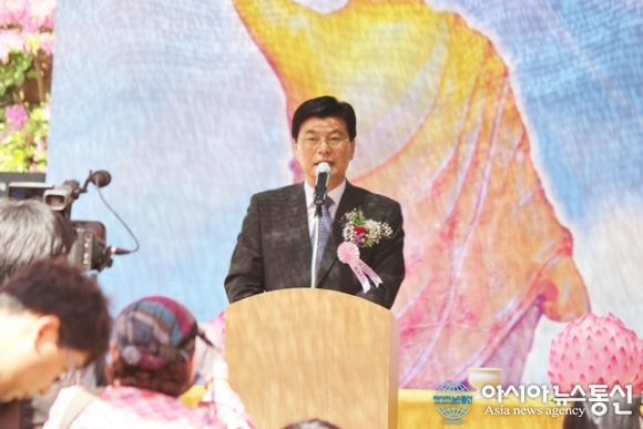 | 3일 불기 2561년 부처님 오신날을 맞아 세종시 장군면에 있는 영평사에서 열린 봉축법요식에서 이춘희 세종시장이 축사를 하고 있다./아시아뉴스통신=홍근진 기자 |