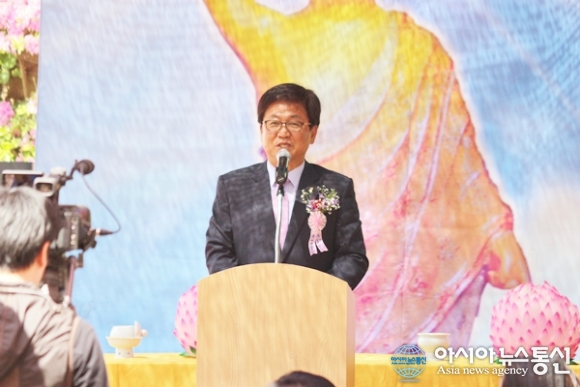 | 3일 불기 2561년 부처님 오신날을 맞아 세종시 장군면에 있는 영평사에서 열린 봉축법요식에서 최교진 세종시교육감이 축사를 하고 있다./아시아뉴스통신=홍근진 기자 |