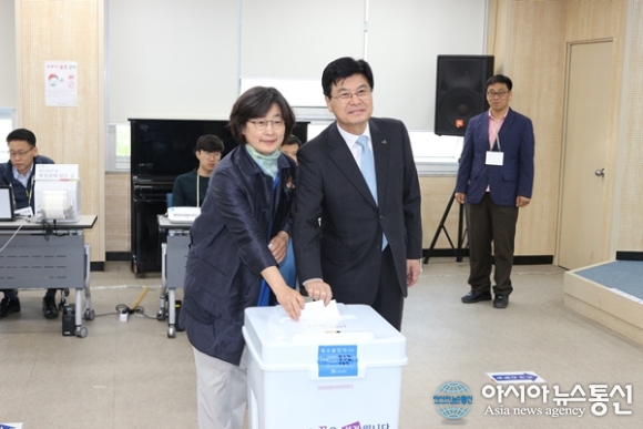 | 제19대 대통령선거 사전투표가 4일 오전 6시부터 전국적으로 시작된 가운데 이춘희 세종시장이 부인 서명숙씨와 함께 조치원읍사무소에 마련된 사전투표소에서 선거를 마쳤다. 이 시장은 소감을 통해 “이번 선거에서 시민들이 선거에 많이 참여해 전국 1위의 투표율을 기록 실질적인 정치행정의 수도로 각인되면 좋겠다”고 밝혔다./아시아뉴스통신=홍근진 기자 |