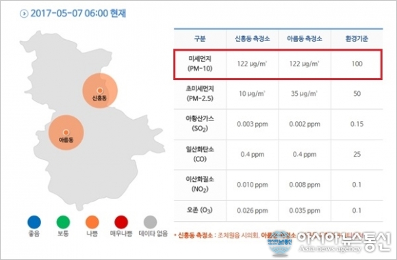 | 7일 오전 6시 현재 미세먼지 농도가 122㎍/㎥을 나타낸 세종시 대기환경정보.(사진출처=세종시청) |