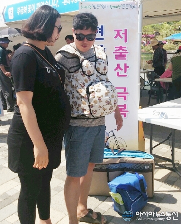 | 지난 5일 세종시가 호수공원에서 열린 어린이날 행사에서 ‘가족이 함께 체험하는 저출산 극복 인식개선 캠페인’을 펼쳐 한 남성이 육아의 어려움을 알게 하는 ‘임신부 체험’을 하고 있다. 이밖에 체험부스에서는 임신 단계별 태아 모형을 전시하고 초보 아빠를 위한 아기 기저귀 교환, 아기 속싸개 싸보기 육아체험 등이 진행됐다.(사진제공=세종시청) |