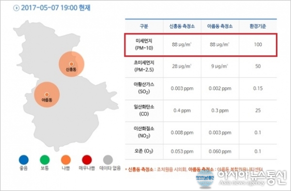 | 세종시가 7일 오후 7시 미세먼지 주의보를 해제했다. 88㎍/㎥를 나타내고 있는 세종시 대기환경정보.(사진출처=세종시청) |