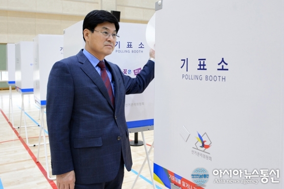 | 이춘희 세종시장이 제19대 대선을 앞둔 8일 투표소를 찾아 준비 상황을 점검하고 “투표율 1위를 달성해 행정수도 완성에 힘이 될 수 있도록 투표권을 행사해 달라”고 시민들의 투표 참여를 당부했다. 세종시는 지난 4~5일 실시된 사전투표에서 34.48%로 전국 최고의 투표율을 기록했었다.(사진제공=세종시청) |