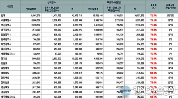 전국적으로는 총 3089만 7679명이 투표를 마쳐 72.7%의 투표율을 보이고 있으며 제주도가 68.1%로 가장 낮은 투표율을 나타내고 있다.