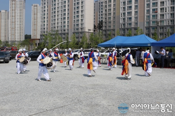 | 18일 세종시 도담동 로컬푸드 직매장 싱싱장터 부지에서 열린 싱싱문화관 기공식에 앞서 풍물놀이패가 터밟기 공연을 펼치고 있다./아시아뉴스통신=홍근진 기자 |