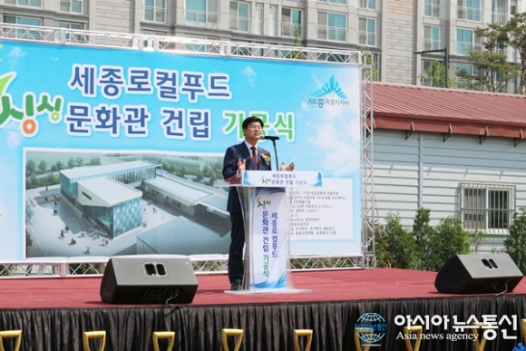| 18일 세종시 도담동 로컬푸드 직매장 싱싱장터 부지에서 열린 싱싱문화관 기공식에서 이춘희 세종시장이 기념사를 하고 있다. 이 시장은 “싱싱문화관을 생산자와 소비자가 공감하는 세종형 로컬푸드 운동의 거점으로 만들겠다”고 밝혔다./아시아뉴스통신=홍근진 기자 |