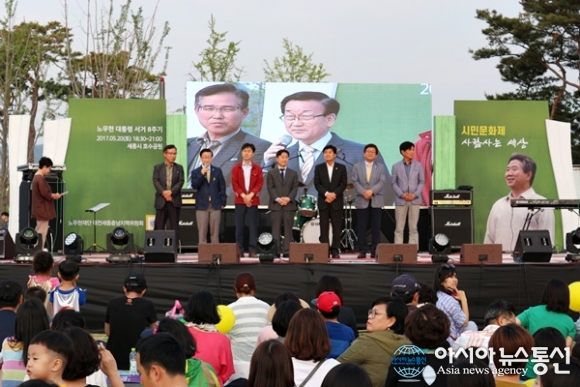 | 20일 노무현재단 대전세종충남지역위원회가 세종시 호수공원 매화공연장에서 개최한 노무현 대통령 서거8주기 추모 시민문화제 ‘사람사는 세상’에 참석한 (왼쪽부터)임각철 충청남도 정책특보, 윤일규 순천향의대 명예교수, 한창민 정의당 대전시당위원장, 박범계 민주당 대전서구을 국회의원, 이춘희 세종시장, 최교진 세종시교육감, 조승래 민주당 대전유성갑 국회의원. 윤 교수가 지역위원회 상임대표를 맡고 있고 임 특보, 한 위원장, 박 의원, 최 교육감, 조 의원은 공동대표를 맡고 있다./아시아뉴스통신=홍근진 기자 |