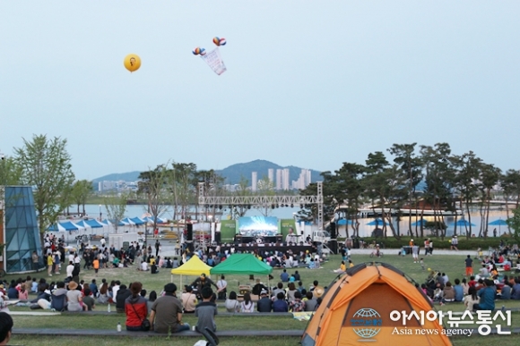 | 20일 노무현재단 대전세종충남지역위원회가 세종시 호수공원 일원에서 개최한 노무현 대통령 서거8주기 추모 시민문화제 ‘사람사는 세상’ 전경. 하늘엔 故 노무현 대통령의 얼굴이 그려져 있는 대형 노란풍선이 떠있고 매화공연장엔 텐트를 치고 공연을 즐기는 시민들도 있다./아시아뉴스통신=홍근진 기자 |