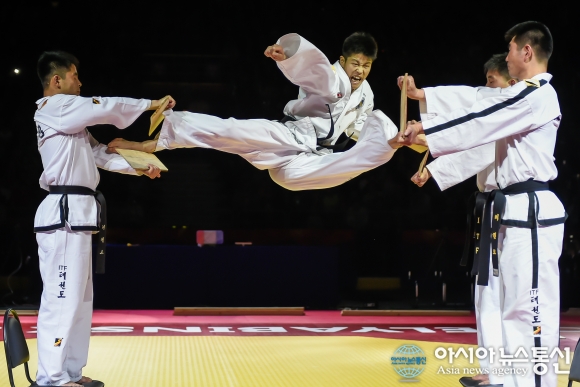 | ITF 태권도 시범단이 지난 2015년 5월 12일 러시아 첼랴빈스크 트락토르 아레나에서 열린 2015 WTF 세계선수권대회 개회식에서 시범 공연을 선보이고 있다.(사진제공=WTF) |