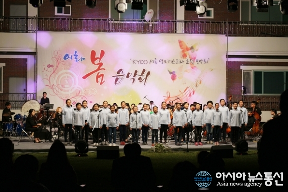 | 25일 세종시 전동면 솔티고개에 있는 사회복지법인 이화(대표 박정자) 잔디마당에서 KYDO세종영오케스트라(지휘 서창규) 초청 음악회가 열렸다. 올해로 일곱번째를 맞는 음악회는 문화소외계층인 시설장애인들에게 클래식을 접할 수 있는 기회를 제공코자 마련됐다. 굴렁쇠 어린이 합창단이 '법꽃팝콘' '꿈꾸지 않으면'을 노래하고 있다./아시아뉴스통신=홍근진 기자 |