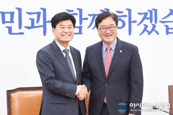 | 이춘희 세종시장(왼쪽)이 26일 국회를 방문해 우원식 더불어민주당 원내대표(오른쪽)를 만나 악수를 하고 있다. 이날 이 시장은 우 대표와 이춘석 사무총장, 우윤근 국회사무처 사무총장, 김교흥 국회의장 비서실장 등을 잇따라 만나 세종시에 국회분원 조속 설치와 ‘세종시=행정수도’를 담은 개헌의 필요성을 강조하고 협조를 구했다.(사진제공=세종시청) |