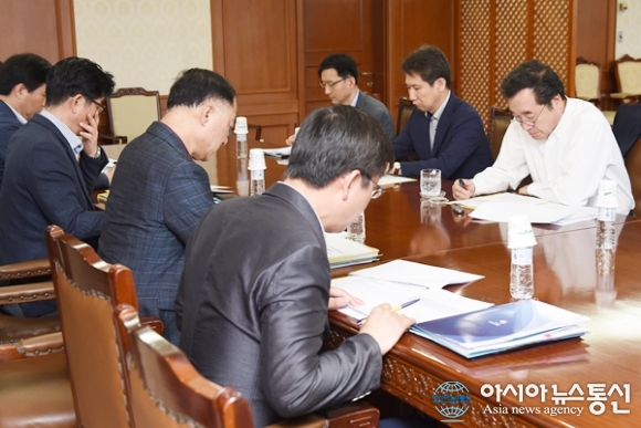 | 이낙연 국무총리가 3일 정부서울청사 집무실에서 총리실 간부들과 당면 국정현안에 대해 논의하고 있다.(사진제공=국무총리실) |