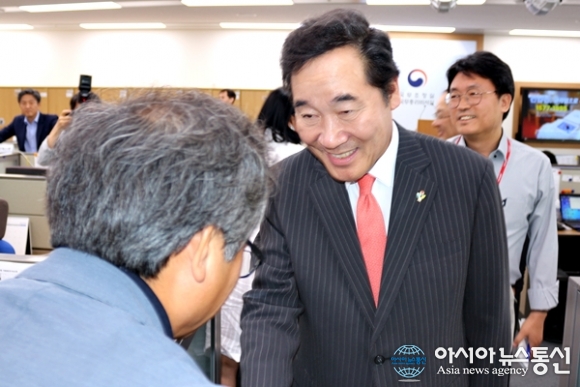 | 5일 이낙연 국무총리가 취임 후 처음으로 정부세종청사 기자실을 방문해 간담회에 앞서 출입기자들과 악수를 하고 있다./아시아뉴스통신=홍근진 기자 |