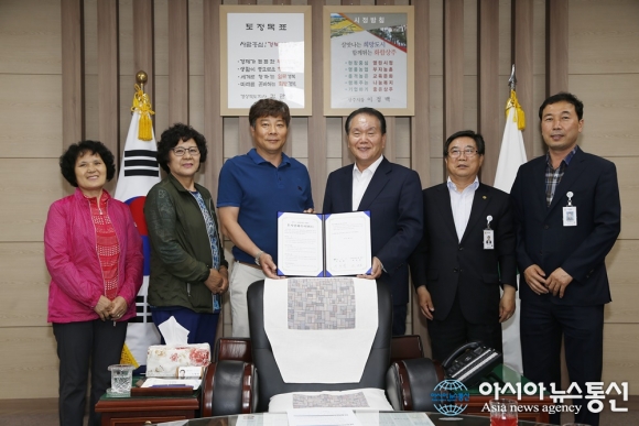 | 7일 이정백 경북 상주시장이 내년에 상주공장을 건립할 예정인 농업회사법인 세영의 박중영 대표 등 관계자들과 협약서를 들고 포즈를 취하고 있다.(사진제공=상주시청) |