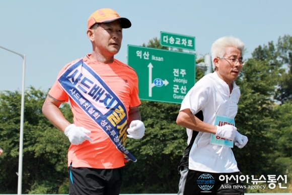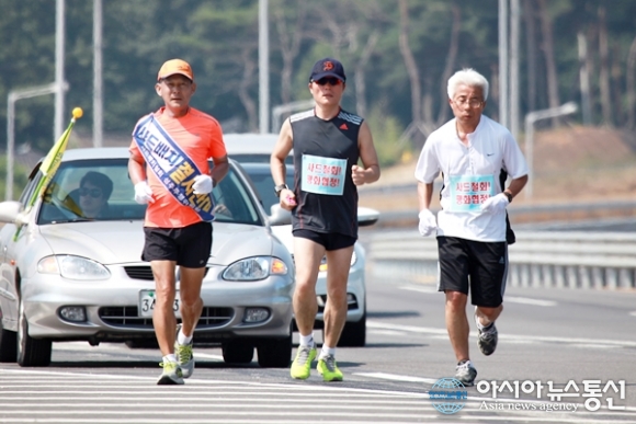| 지난 6일 제주를 출발해 광화문까지 달리고 있는 평화 마라토너 강명구씨(왼쪽)가 18일 익산에서 논산으로 달리고 있다.(사진출처=평화마라톤) |