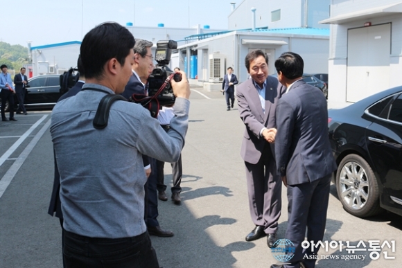 | 이낙연 국무총리가 23일 소재전문 우수 중소기업인 세종시 전의 제2산업단지에 있는 (주)레이크머티리얼즈를 방문해 주영섭 중소기업청장, 임채운 중소기업진흥공단 이사장, 이춘희 세종시장, 김진동 대표이사의 영접을 받고 있다./아시아뉴스통신=홍근진기자 |