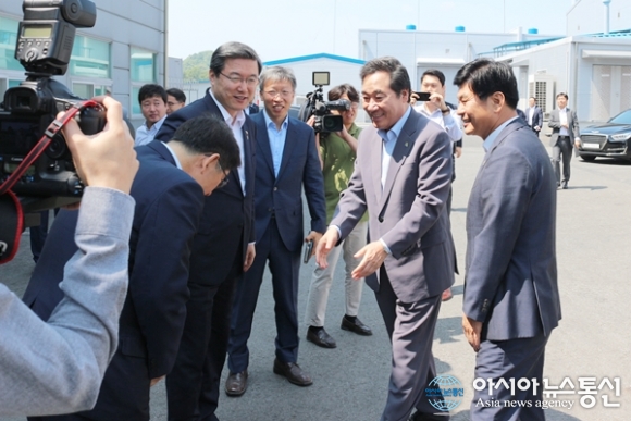 | 이낙연 국무총리가 23일 소재전문 우수 중소기업이며 세종시 전의 제2산업단지에 있는 (주)레이크머티리얼즈를 방문해 주영섭 중소기업청장, 임채운 중소기업진흥공단 이사장, 이춘희 세종시장, 김진동 대표이사의 영접을 받고 있다./아시아뉴스통신=홍근진기자 |